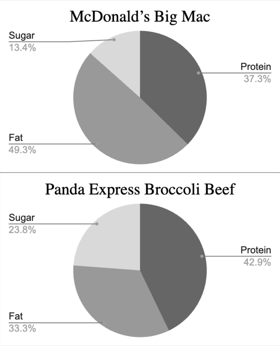 These pie charts show that the Big Mac and the Panda Express Broccoli Beef entrée deliver very different “macronutrient profiles” even though both might be seen as a single main dish. In the Big Mac chart, almost half of the calories come from fat and only around a third from protein, with a smaller but still noticeable slice from sugar; that confirms the burger is a relatively high‑fat, moderate‑protein option where the bun and sauces quietly add sugar on top.